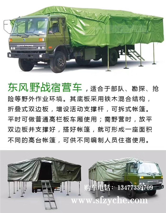 東風(fēng)原廠EQ5118XZS6D15型宿營車和EQ5120GA1型天錦宿營車6.1米篷布配套直供。適用于東風(fēng)EQ5118XZS6D15宿營車和EQ5120GA1天錦宿營車等東風(fēng)系列車型,軍用宿營車供部隊(duì)野外住宿使用。車箱內(nèi)部尺寸6100mmX2210mmX1850mm。宿營車車廂在采用折疊式雙邊板,增加滑道內(nèi)設(shè)支撐桿,可拆式帳篷。平時(shí)可作為普通高欄板軍車使用;部隊(duì)需野營時(shí),放平雙邊板并支撐好,搭好帳篷,就可以形成一座面積達(dá)38㎡的高臺(tái)帳篷,可供36人住宿用。 東風(fēng)原廠宿營車篷布總成價(jià)格一套為5300元含稅。