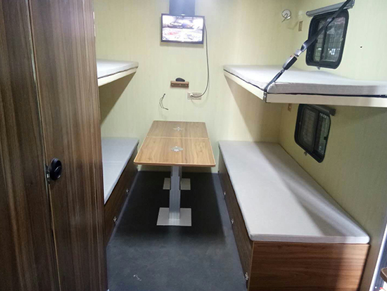 3、休息區(qū)備有4個上下鋪,配有床墊,每個上下床鋪依靠的墻壁上都有一個風景透氣窗。每個床鋪下面設一組附件柜,床位兩側上方各配衣帽鉤、插座和可調(diào)節(jié)床頭燈,休息區(qū)配有19寸液晶電視一臺及空調(diào)一部。