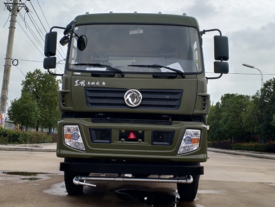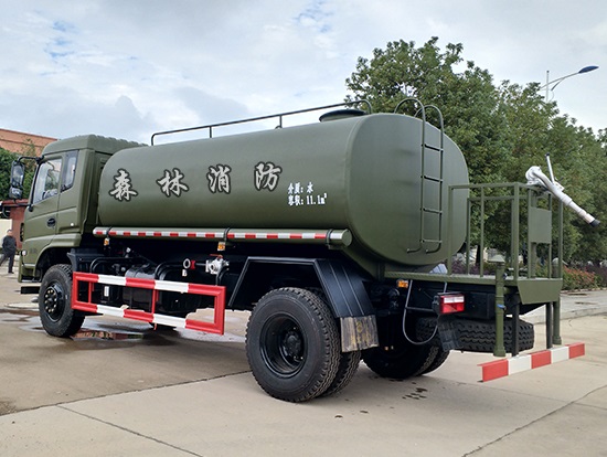 采用東風(fēng)EQ2180GD5DJ型越野汽車底盤,東風(fēng)一排半寬體駕駛室,4×4驅(qū)動,康明斯ISB190 50國五發(fā)動機,六檔變速箱,東風(fēng)商用車橋,前驅(qū)動橋3.8噸,后橋10噸,10.00R20輪胎,軸距4500mm,電動玻璃,方向助力,斷氣剎,ABS。罐體采用優(yōu)質(zhì)碳鋼QB235板材,板材厚度4mm,罐體容積11.1立方,變速箱安裝取力器,大功率水泵可泵進泵出,后置工作平臺帶水炮射程25米,消防栓接口左右各一個,選裝駕駛室頂部安裝長條警燈帶喊話器,全車顏色軍綠,兩側(cè)噴涂白色森林消防字樣。
