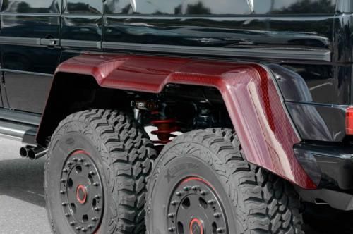 第一眼看去,這輛G63 AMG 6x6的涂裝會(huì)讓人感覺有些怪異。的確,這輛Brabus出品的六輪怪獸換上了紅色碳纖維車身改裝件,后視鏡蓋、輪眉以及引擎蓋都采用了紅色碳纖維材料。透過車窗我們能看到內(nèi)飾同樣是紅色主題,甚至是輪圈內(nèi)也有紅色點(diǎn)綴。